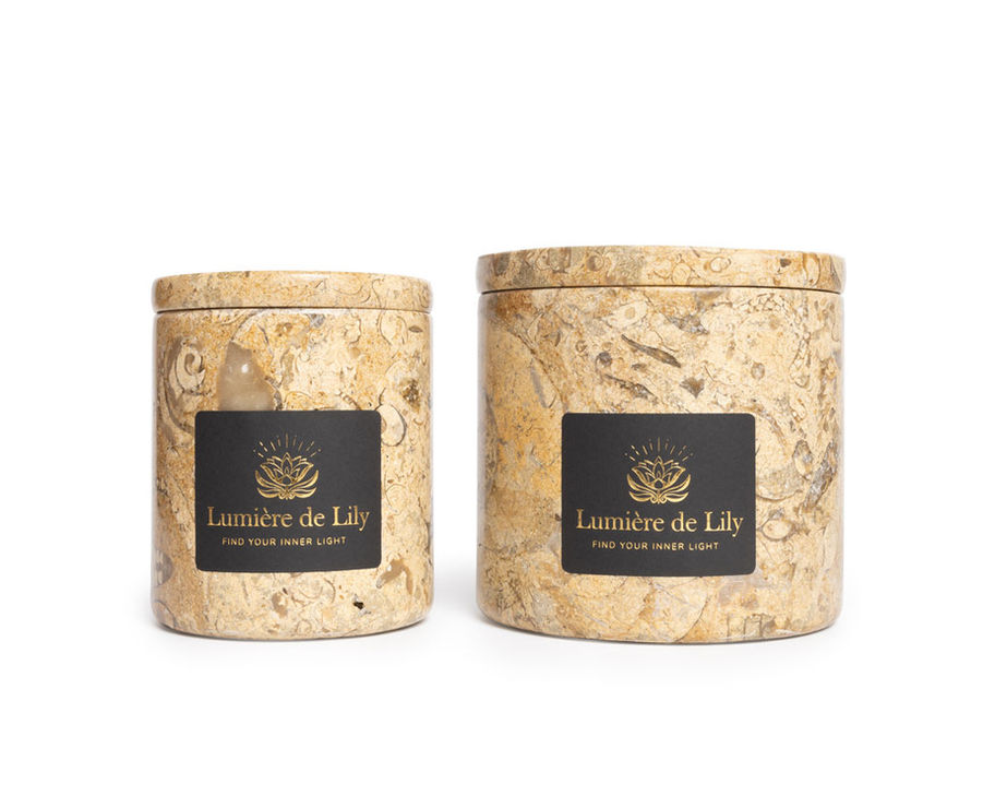 - Hand-poured in the UK, each candle is encased in semi-precious Fossilized Coral to add an elegant touch to any decor