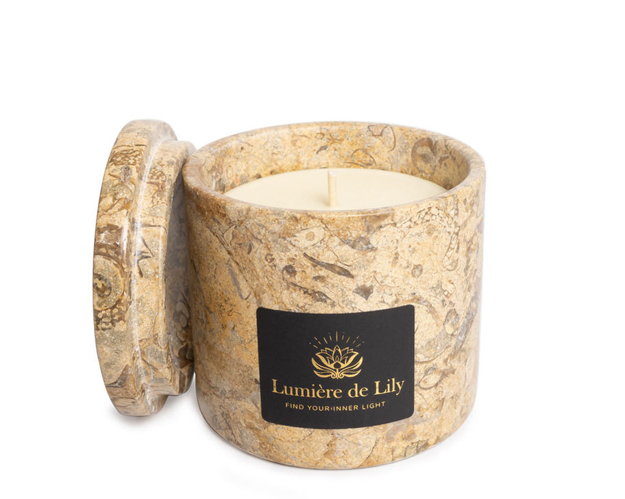 From our Signature Collection. 'STRENGTH' encased in Fossilized Coral your beacon of resilience. Infused with Pachouli, Frankincense, and Bergamot, this hand-poured candle energizes your spirit. Crafted from natural soy wax and essential oils, light 'STRENGTH' to fill your space with courage and resolve.